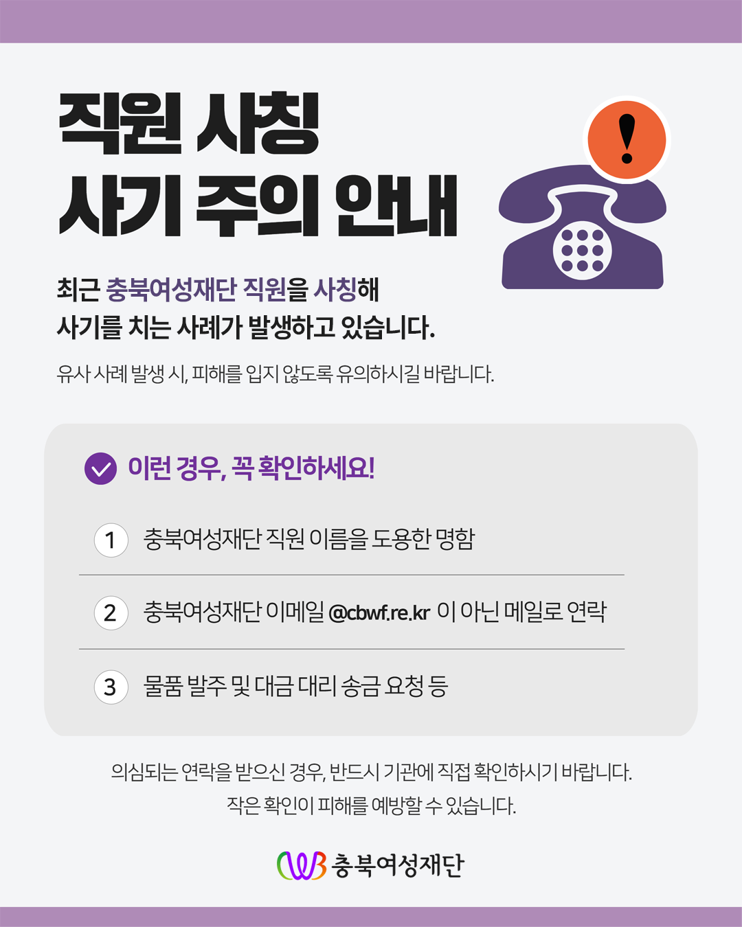 2026년 충북 풀뿌리 여성 활동가 지원사업 공모를 실시합니다.많은 관심과 참여 부탁드립니다 :)1. 신청기간 : 2026.3.24.(화) ~ 2026. 4. 3.(금)2. 신청방법 : 신청서류 이메일 접수( hsj915@cbwf.re.kr ) ※ 메일 제목 및 파일명 : 2026 충북 풀뿌리 여성 활동가 지원사업(소모임명)3. 선정발표 : 2026. 4. 30. 개별연락4. 문 의 : 충북여성재단 교육사업팀 (043-285-2428)2026.03. 23