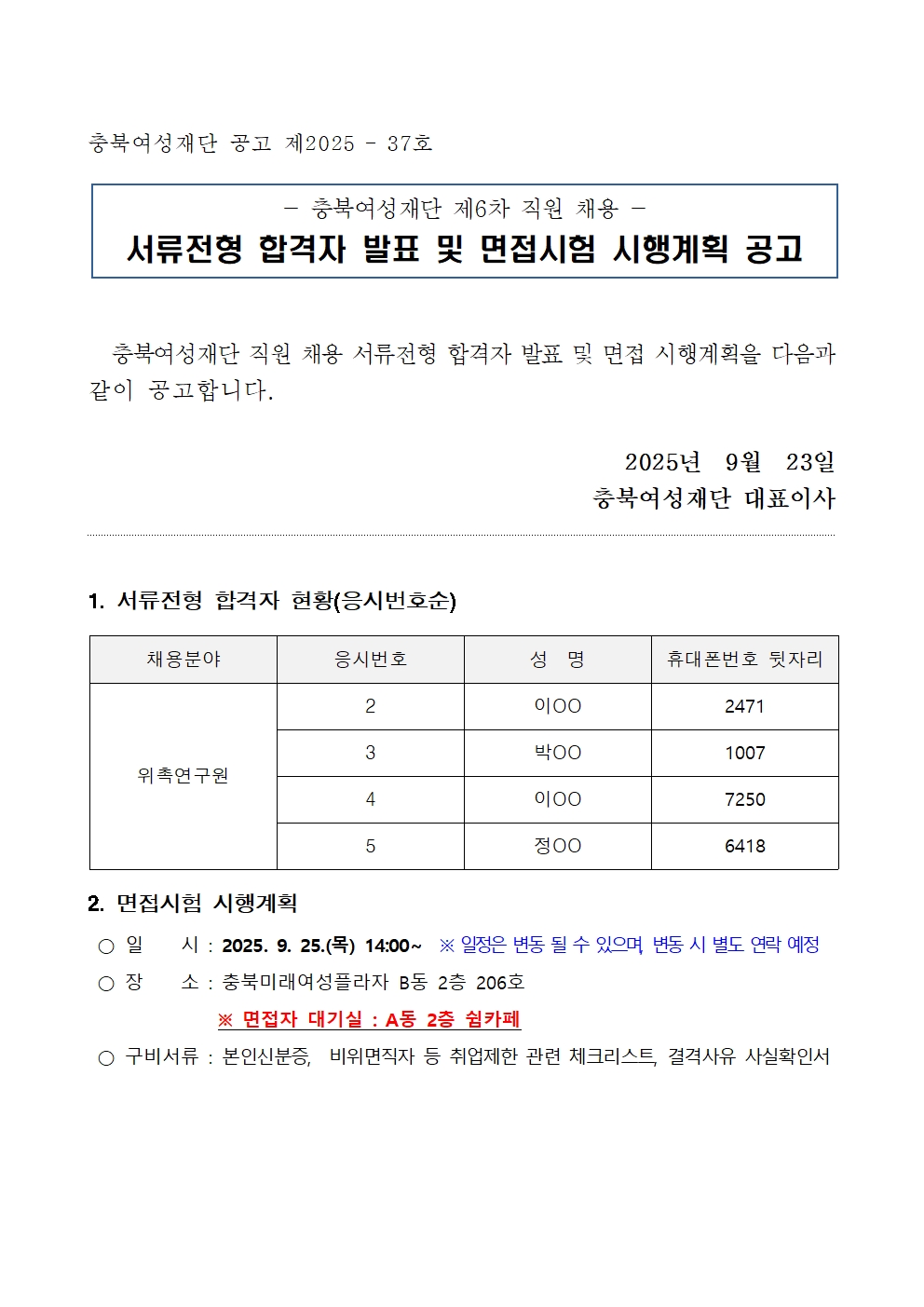 2025-37 공고문(서류전형 합격자 발표 및 면접시험 시행계획공고)다운로드