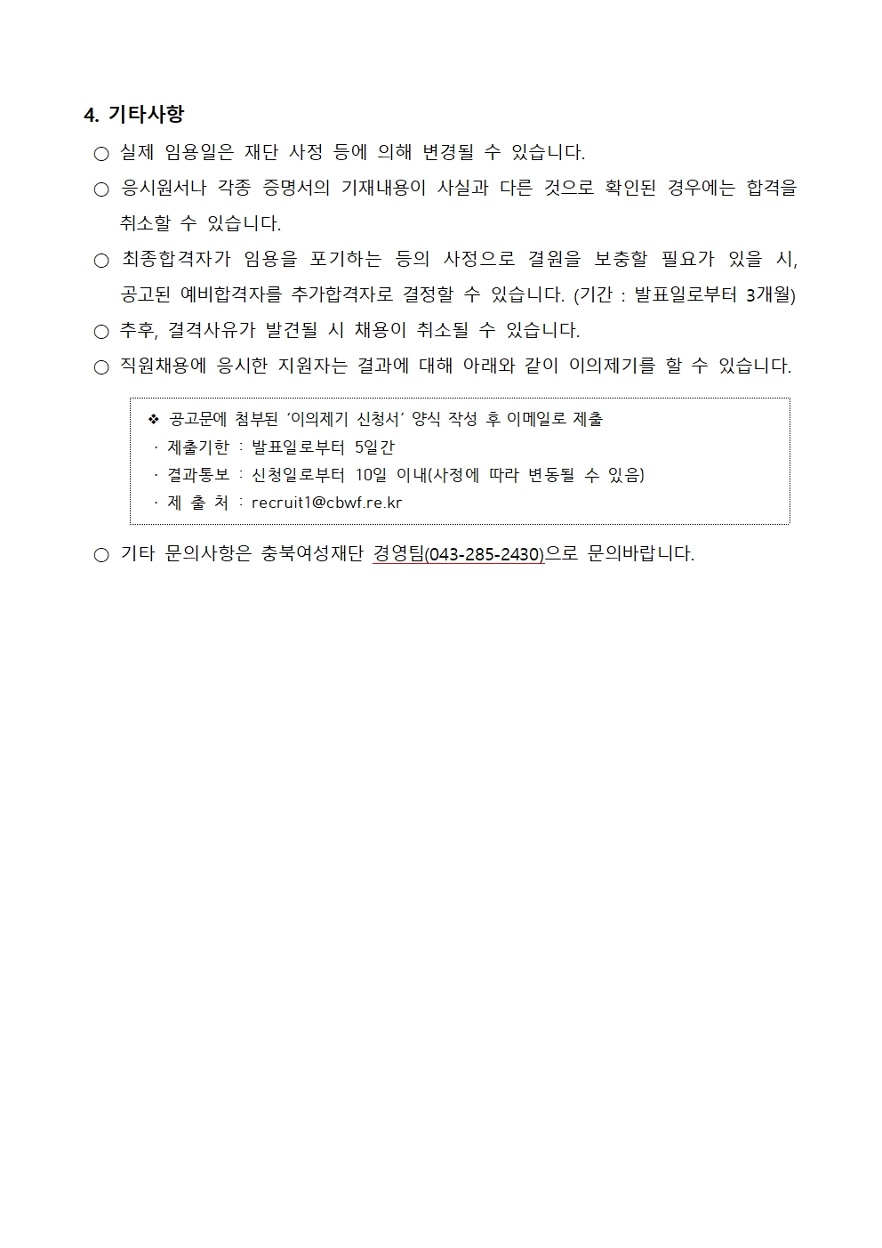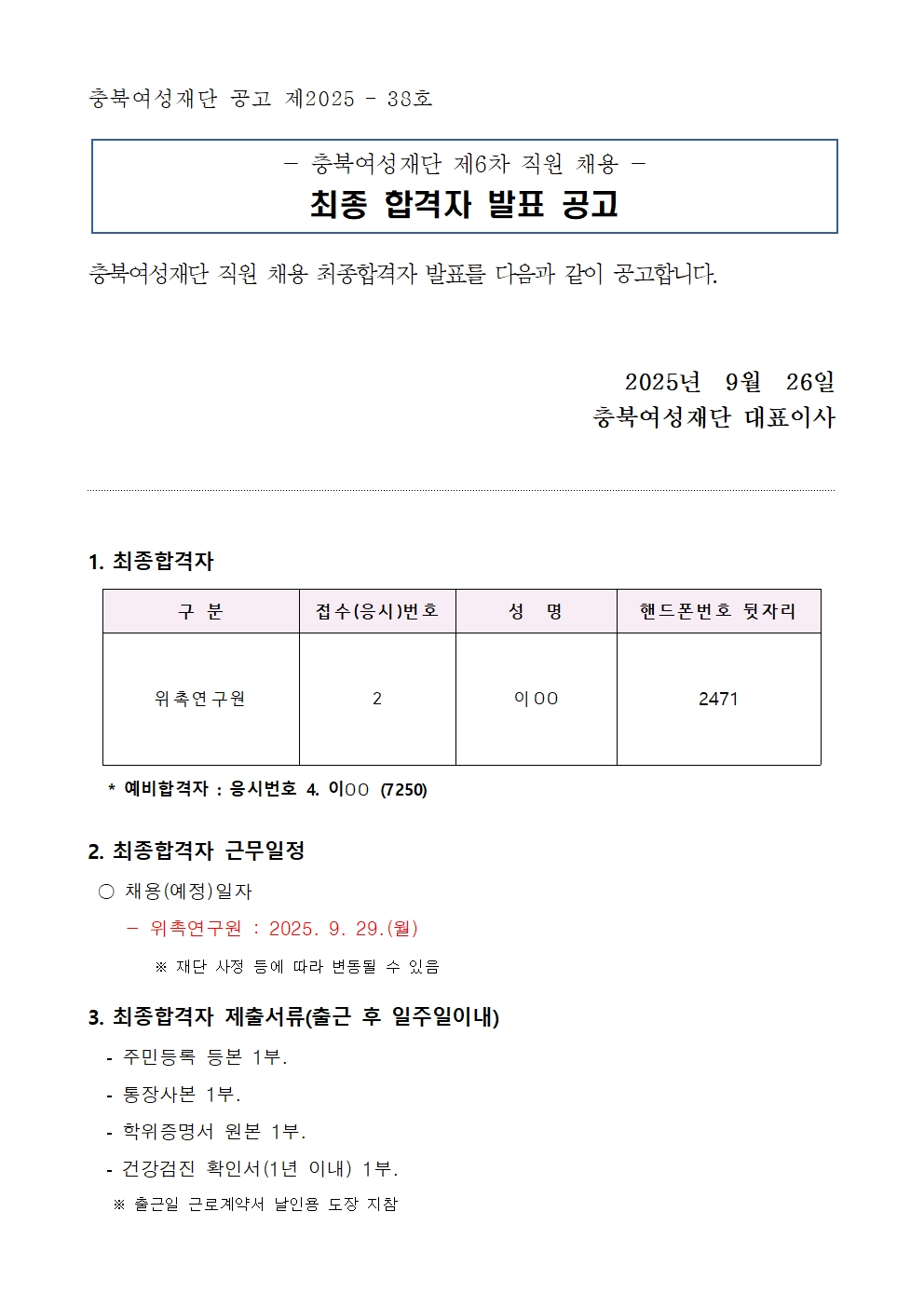 [2025-38] 충북여성재단 제6차 직원 채용 최종합격자 발표공고(위촉연구원)